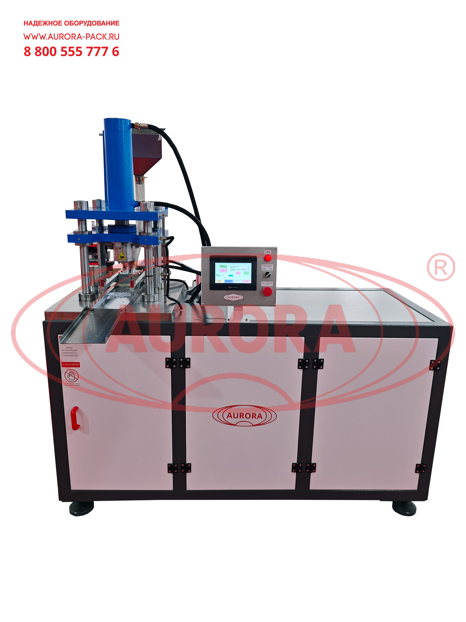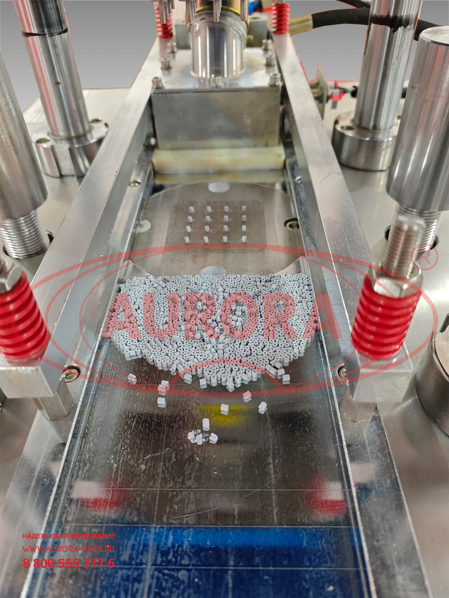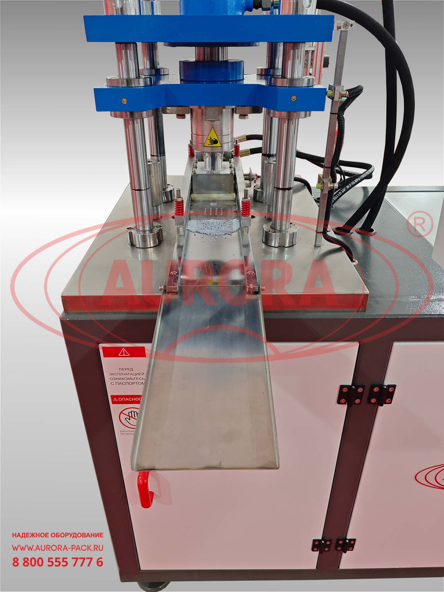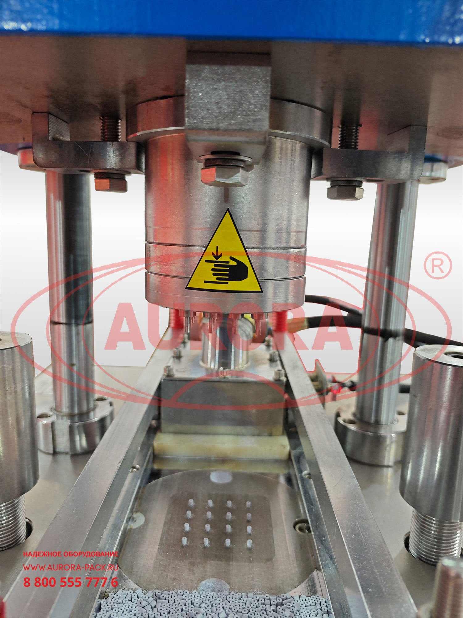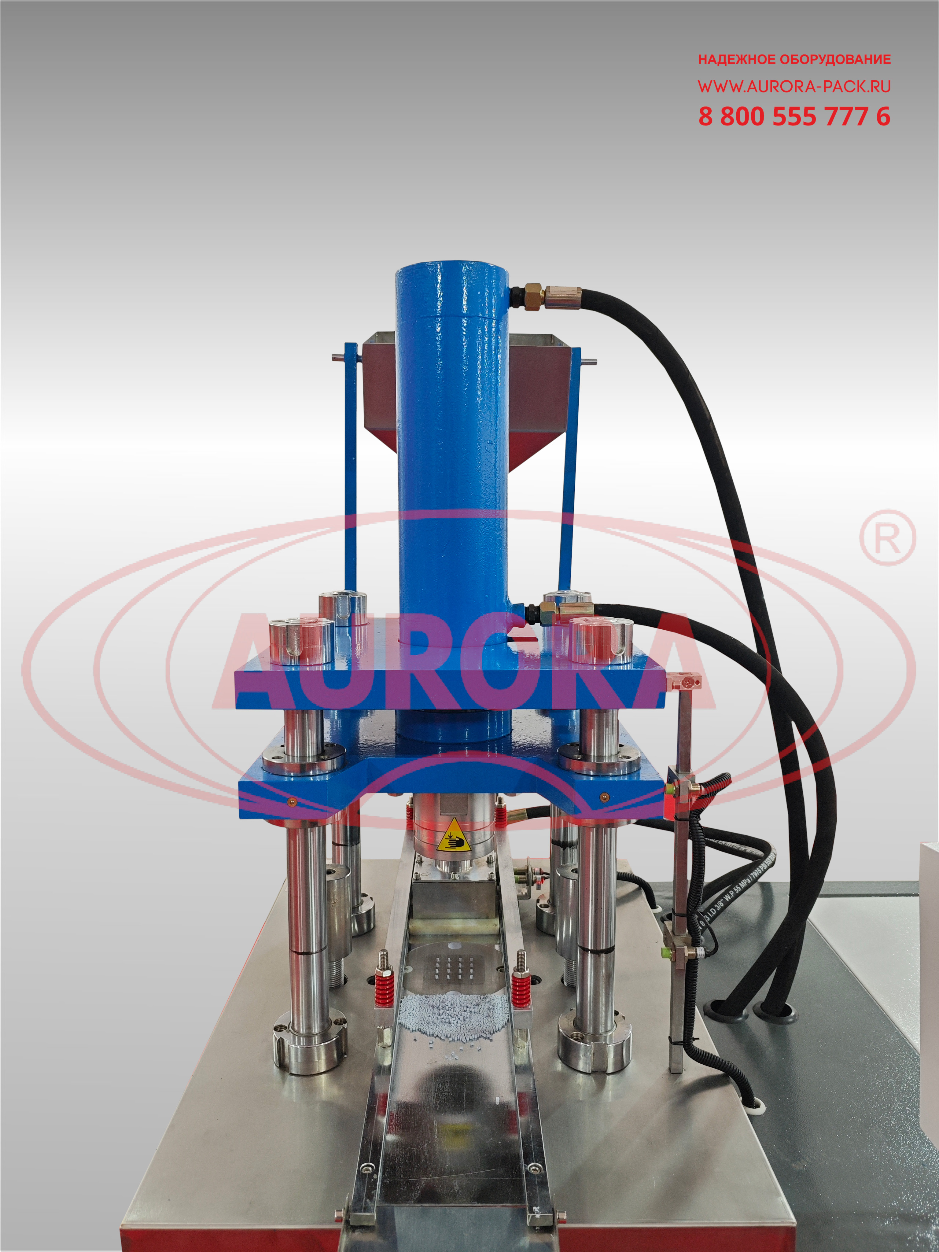 Загрузите продукт в загрузочный бункер, произведите необходимые настройки согласно технологическому процессу и активируйте работу оборудования путем нажатия кнопки в главном окне сенсорной панели управления «Запуск в авторежиме». После нажатия кнопки, дозирующая каретка перемещается в зону подачи продукта, после чего продукт передвижной кареткой подается в зону нижних пуансон. После дозации каретка возвращается в свое начальное положение и только после этого опускается форма с верхними пуансонами, тем самым создавая давление на производимое изделие. В случае включения функции двойного давления срабатывает прижим как верхнего, так и нижнего пуансона. Если функция двойного давления отключена, то давление будет создаваться только на прижим верхнего пуансона. В процессе работы при опускании верхнего пуансона создается давление и открывается специальный штифт, позволяющий нижнему пуансону вытолкнуть готовое изделие из своей полости. После этого нижний пуансон возвратно-поступательным движением возвращается в исходное положение, после чего цикл повторяется.Основные элементы