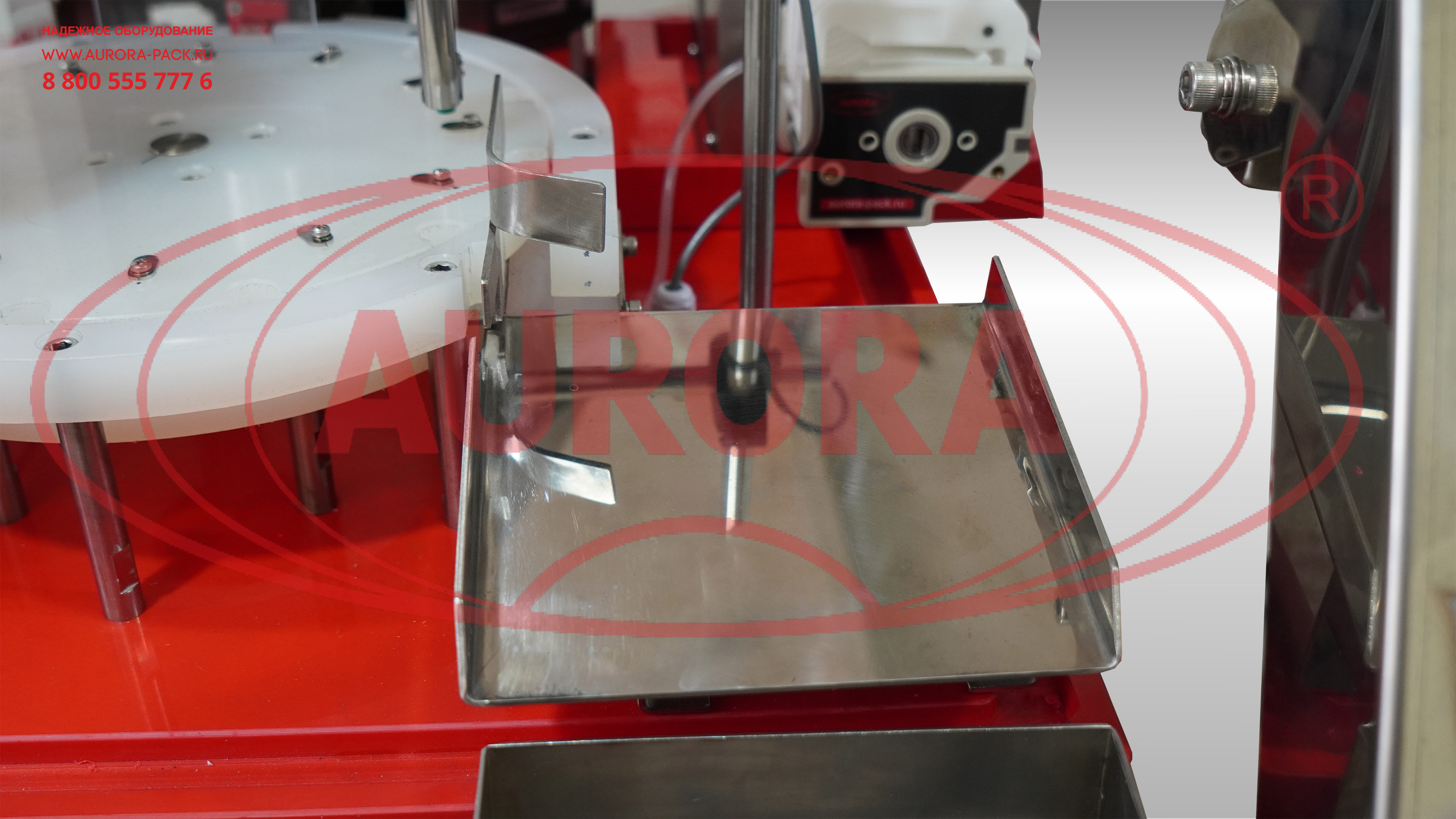 Моноблок производит розлив и укупорку в полуавтоматическом режиме. Поворотный делительный стол пошагово перемещает флаконы между узлами. Для каждой единицы тары предусмотрен индивидуальный слот, обеспечивающий ее фиксацию и отсутствие риска падения. Для накопления наполненных и укупоренных флаконов установлен приемный лоток.